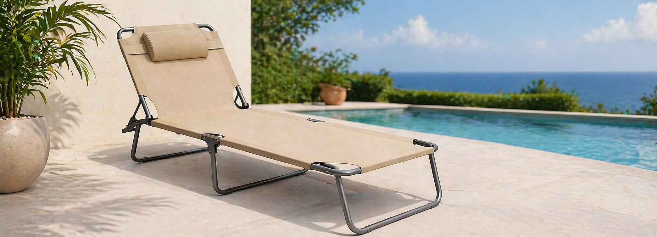 Leichte und stabile Sonnenliege mit verstellbarer Rückenlehne und integriertem Kopfkissen. Ideal für Garten, Terrasse oder Pool – komfortabel, platzsparend und einfach zu transportieren.