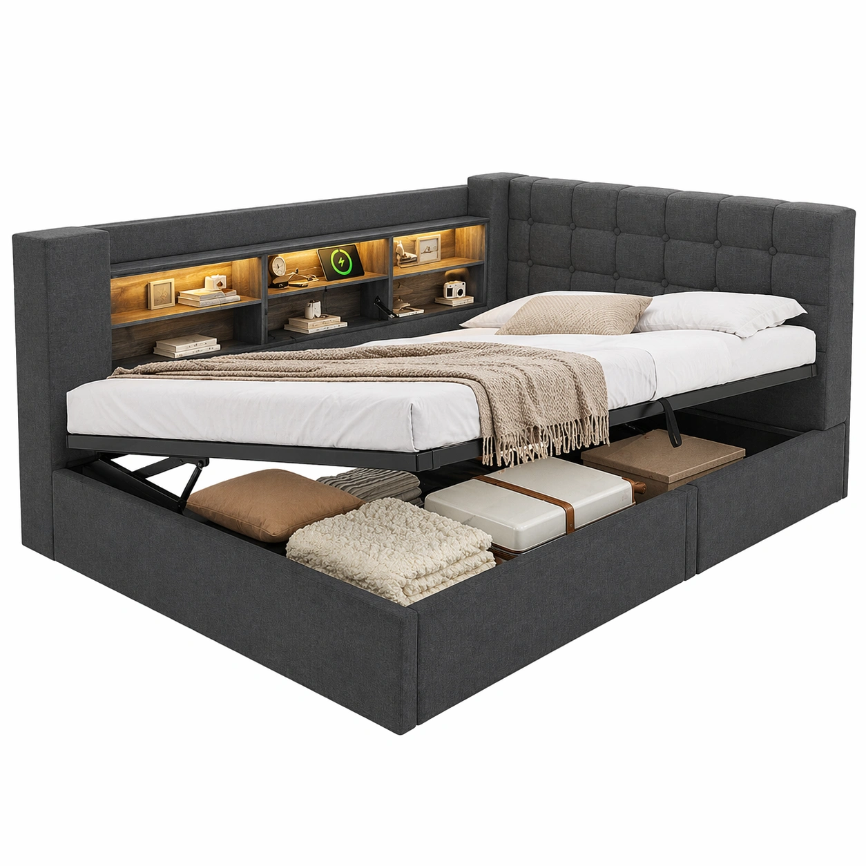 L foermiges Kopfteil mit offenen Regalen bietet praktische Ablageflaeche fuer Buecher Dekoration und Alltagsgegenstaende